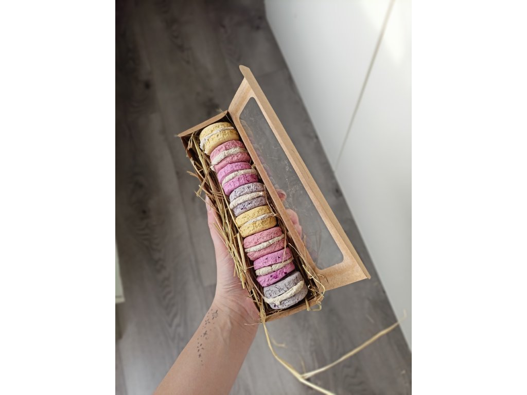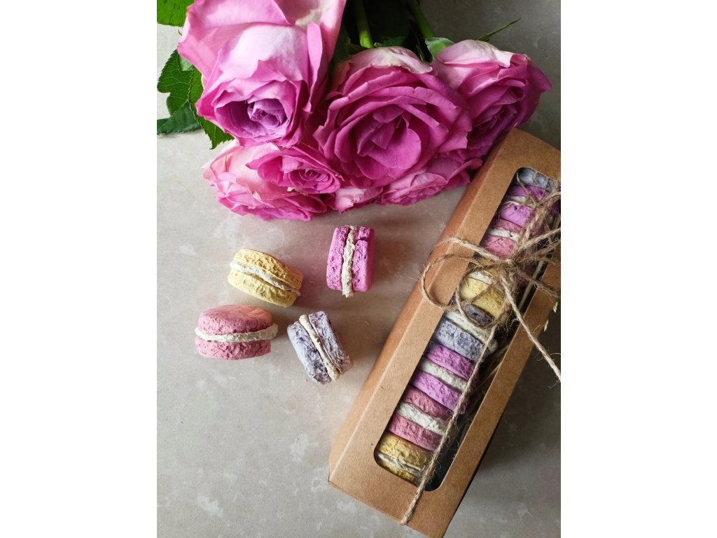 Základ tvoří ovesné vločky a kořen pampelišky, doplněné o směs ovoce a zeleniny: dýni, borůvky, dračí ovoce, malinu, řepu a jahodu. Každá makronka nabízí přirozenou rozmanitost chutí a barev.