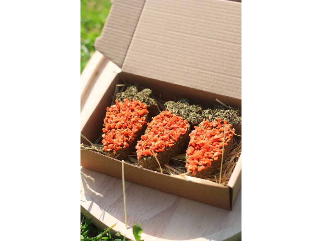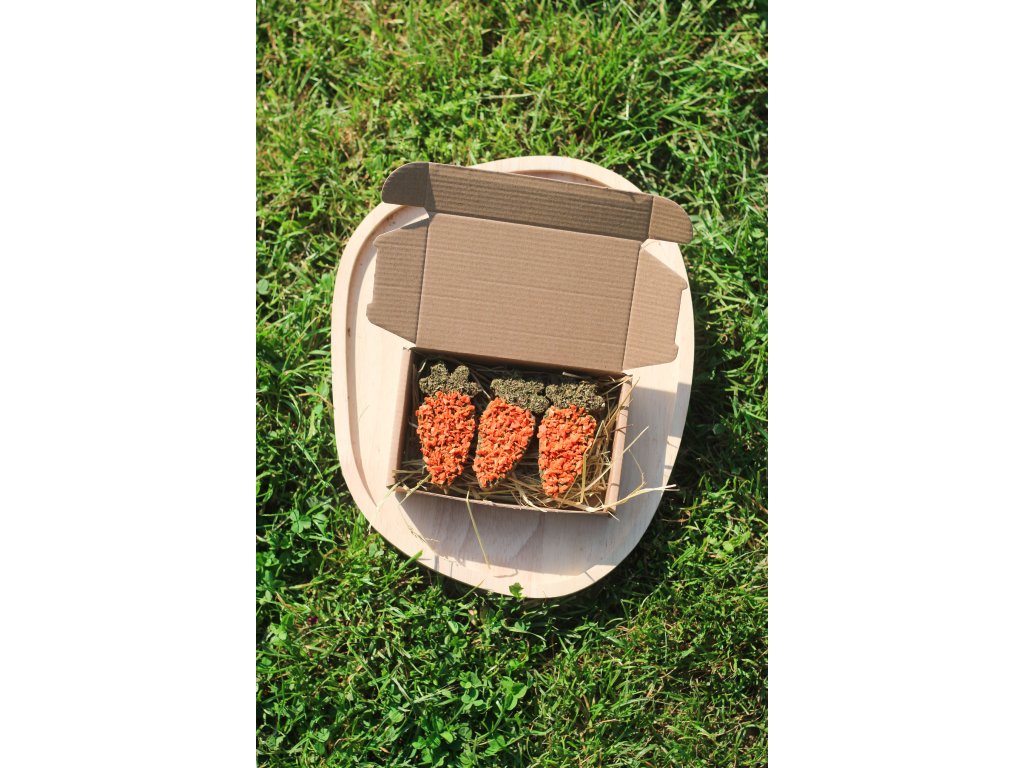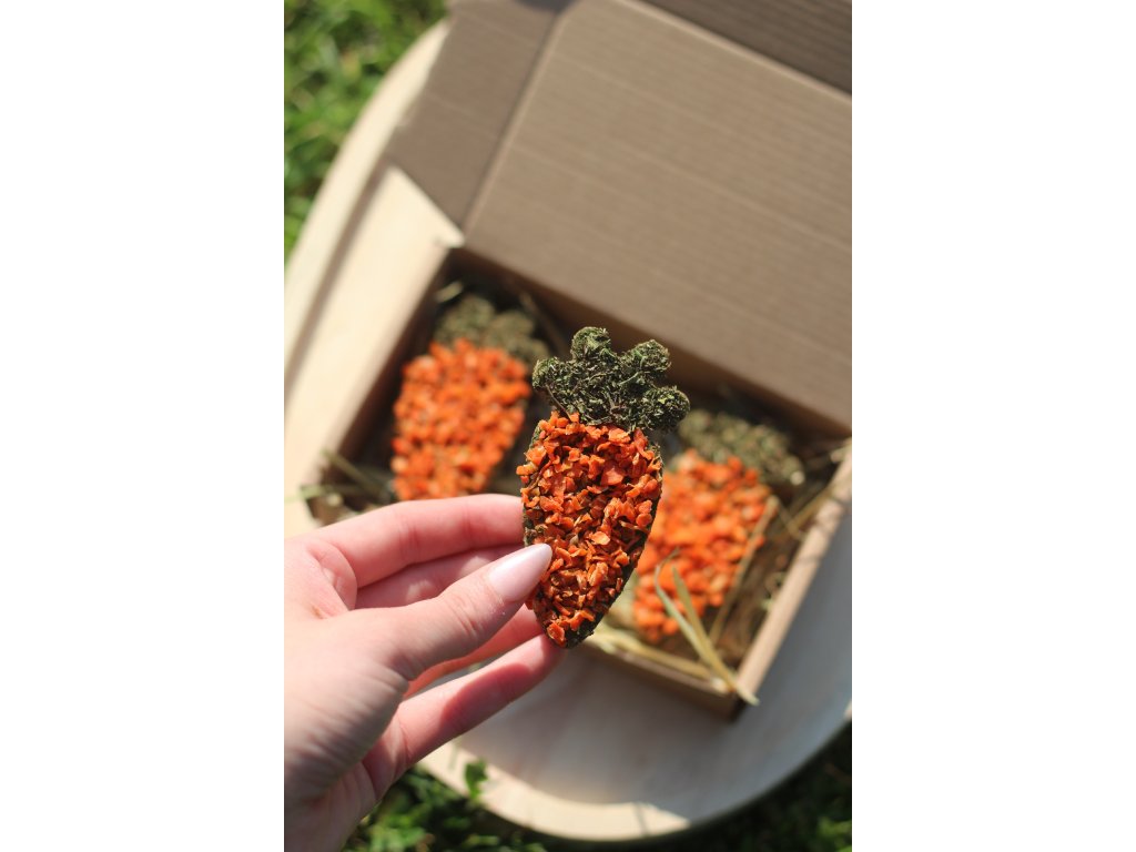 Bezobilné sušenky ve tvaru mrkviček. Vhodné pro králíčky a hlodavce.
