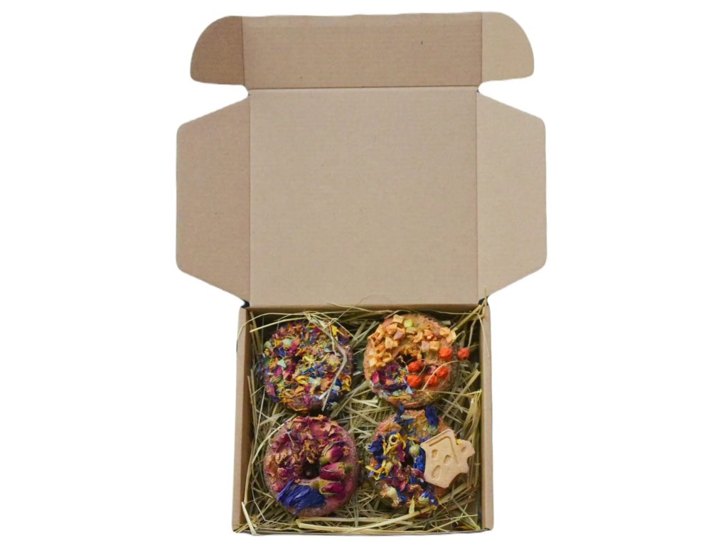 Seno, meduňka, dobromysl, řebříček, jahodové listí, mrkev, řepa, jablko, ovesné vločky, kořen pampelišky