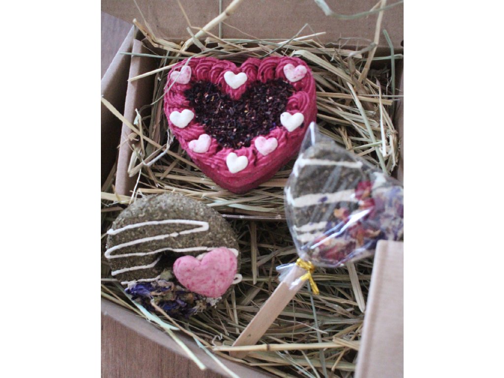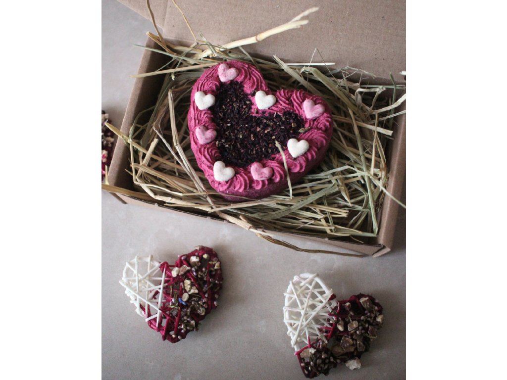 Valentýnský dortíček je tvořený ze sena, lněného semínka, řepy, celeru, ibišku, jahody, kořene pampelišky a ovesných vloček – voňavý, barevný a plný přírodních chutí. 🌸🍓